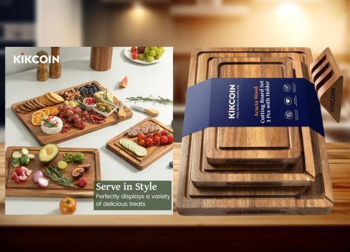 The Kikcoin 3-piece acacia cutting board set stands out with its included storage holder and built-in ingredient compartments. Crafted from dense acacia, each board feels solid and resists warping with proper care. The deep juice groove helps control spills when carving meat, while the side compartments are useful for holding chopped onions or sliced herbs during meal prep. Compared to standard flat boards, this set offers better organization and presentation, especially for charcuterie nights. Though hand-wash only, the durability and thoughtful design justify the price for busy home kitchens.