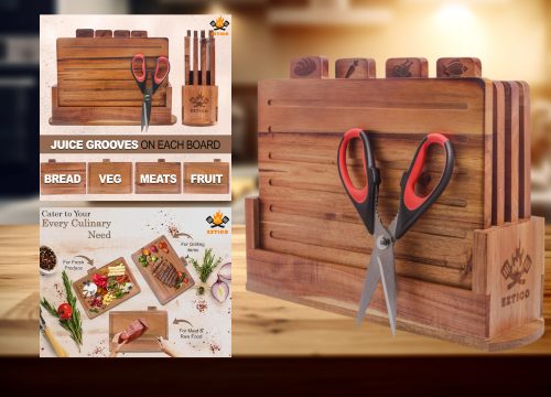 13. EZTICO Acacia Wood Cutting Board Set with Stand & Scissors – Deep Juice Groove Charcuterie & Prep Board
