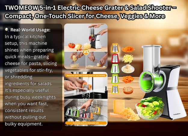 The TWOMEOW 5-in-1 electric cheese grater is built for efficiency in everyday kitchens, especially for home cooks who want quick prep without the hassle of manual grating. From a chef’s standpoint, its compact, modern design makes it ideal for tight spaces while still offering solid versatility.