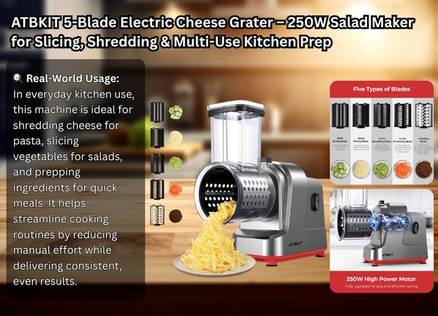 3. ATBKIT 5-Blade Electric Cheese Grater – 250W Salad Maker for Slicing, Shredding & Multi-Use Kitchen Prep