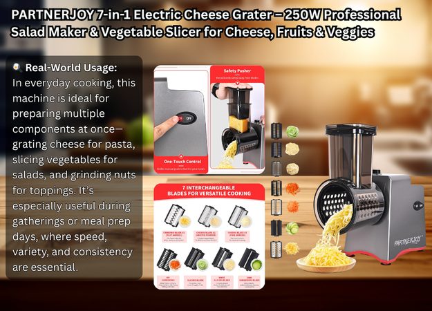 The PARTNERJOY 7-in-1 electric cheese grater is designed for users who want maximum versatility in a single kitchen appliance. From a chef’s perspective, this model feels closer to a compact prep station than a simple grater, making it a strong option for home kitchens that handle a variety of ingredients daily.