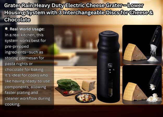 The Grater Rain lower housing electric cheese grater is a unique, modular-style kitchen tool designed with a professional mindset in mind. Unlike typical countertop graters, this system focuses on storage efficiency and prep readiness, making it interesting from a chef’s perspective who values organized mise en place.