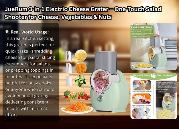 The JueRum 3-in-1 electric cheese grater is a practical tool designed for speed, simplicity, and everyday cooking efficiency. From a chef’s perspective, this unit focuses on doing the basics well—making it a solid choice for home kitchens that need quick prep without unnecessary complexity.