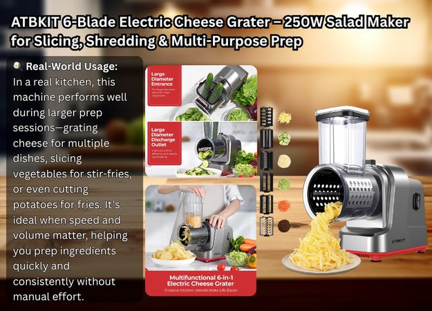 The ATBKIT 5-blade electric cheese grater is a practical and efficient kitchen tool designed for everyday cooking tasks. From a chef’s perspective, it delivers a strong balance of power, versatility, and simplicity, making it suitable for home kitchens that need quick and consistent prep results.
