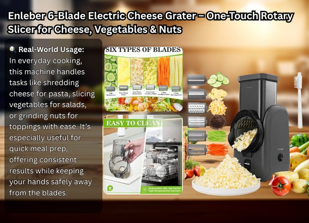 The Enleber 6-blade electric cheese grater is designed for cooks who want both versatility and safety in one machine. From a chef’s point of view, this model combines efficient prep with thoughtful safety features—something not all electric graters get right.