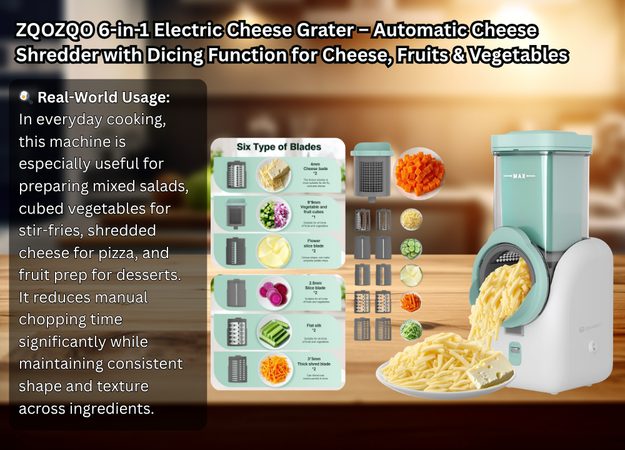 The ZQOZQO 6-in-1 electric cheese grater is a versatile kitchen tool designed for cooks who want more than just basic shredding. From a chef’s perspective, this model stands out because it goes beyond standard grating and introduces real prep flexibility, especially with its dicing and multi-cut functionality.
