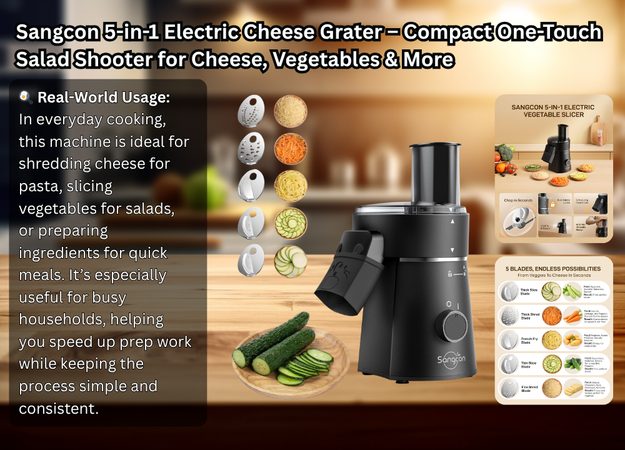 1. Sangcon 5-in-1 Electric Cheese Grater – Compact One-Touch Salad Shooter for Cheese, Vegetables & More