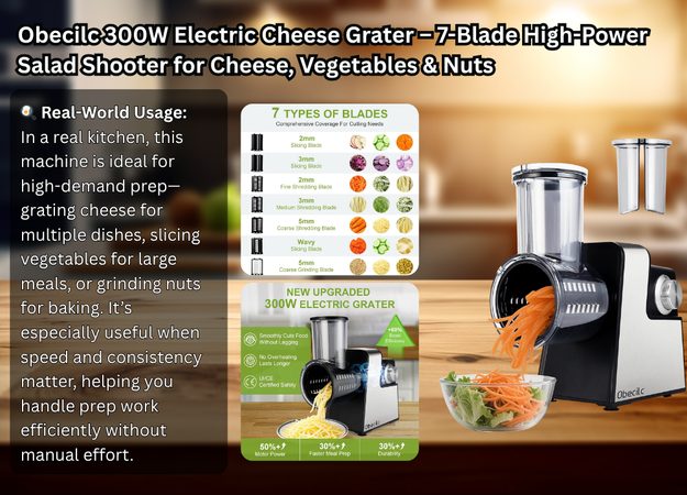 The obecilc 300W electric cheese grater is built for serious home cooks who want more power and precision in their prep work. From a chef’s perspective, this model stands out as one of the more capable machines in its category, especially for handling tougher ingredients and larger quantities.