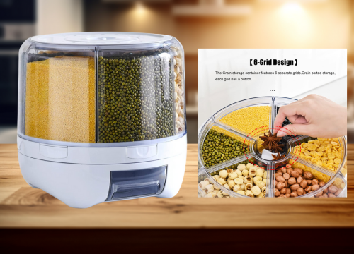 12. XIYAO 20 lbs Rotating Grain Dispenser: 6-Grid Storage, Easy Access & Space-Saving Design