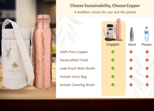 Unlike plastic bottles, copper bottles are fully reusable and recyclable, reducing environmental waste while providing a long-lasting hydration solution.