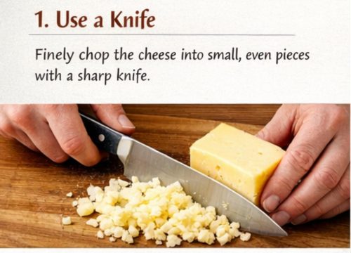 This is the most accessible and reliable method—exactly as shown in the image where the cheese is finely chopped into small, crumb-like pieces.