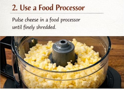 The image clearly shows cheese being pulsed in a food processor into evenly broken pieces. This is the closest alternative to a box grater in terms of efficiency.