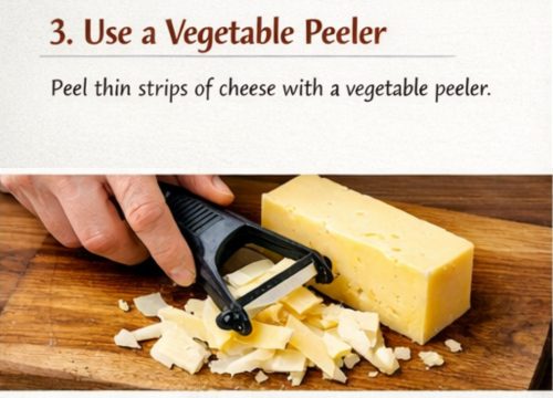 In the image, thin cheese strips are shaved using a peeler. This technique creates delicate slices rather than traditional shreds.
