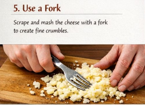 The final image shows cheese being mashed and scraped with a fork into small crumbles. This is a simple, underrated method.