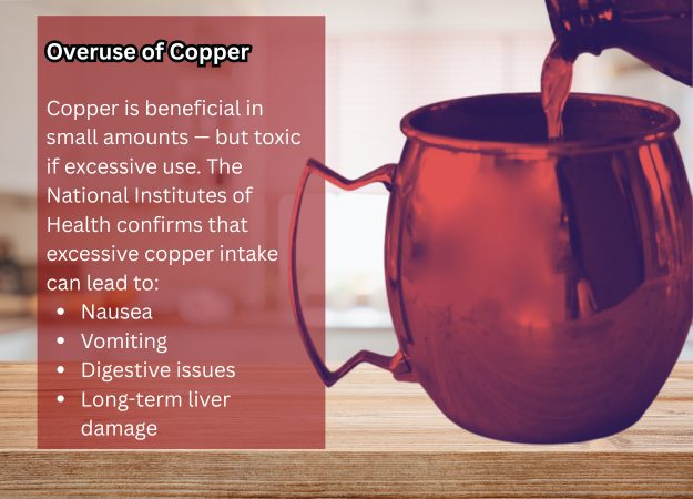Copper is beneficial in small amounts — but toxic in excess. The National Institutes of Health warns that high copper intake can lead to: