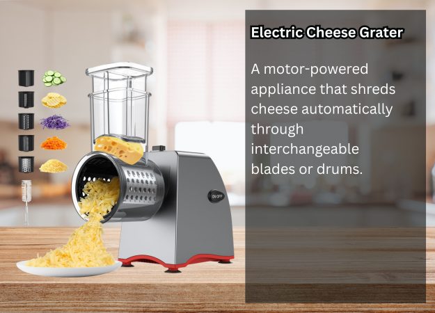 An electric cheese grater is a motor-powered appliance that shreds cheese automatically through interchangeable blades or drums.