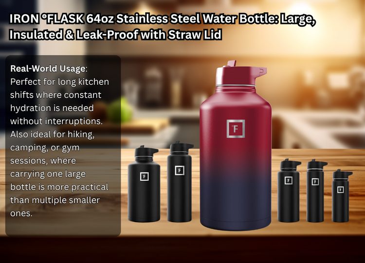 For those who need serious hydration capacity, the IRON °FLASK 64oz stainless steel water bottle is built to handle long hours without constant refills. Whether you’re working in a hot kitchen or spending the day outdoors, this large insulated water bottle provides dependable performance with its double-wall construction, keeping drinks cold for up to 24 hours and hot for around 12.