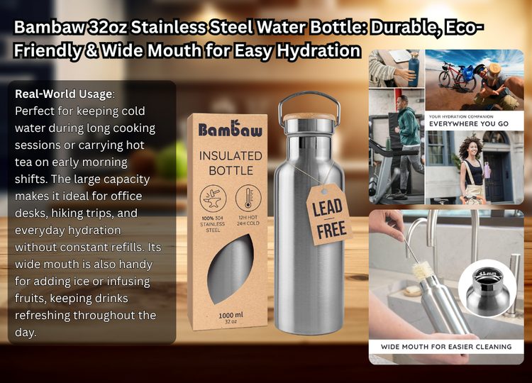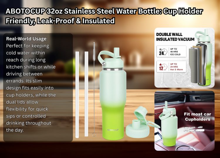 The ABOTOCUP 32oz stainless steel water bottle is designed with practicality in mind, especially for those who need hydration on the move. Its standout feature is the slim T-shaped design, allowing it to fit into standard car cup holders—something many larger insulated water bottles struggle with. For chefs commuting to work or managing errands between shifts, this small detail makes a big difference.