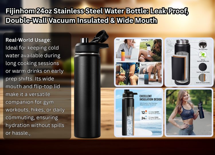 For chefs, home cooks, or anyone spending long hours on their feet, the Fijinhom 24oz stainless steel water bottle offers reliable hydration without compromise. Built from 304 food-grade stainless steel, this vacuum insulated water bottle keeps cold drinks icy for up to 24 hours and hot beverages warm for up to 12 hours—perfect for long prep sessions or early morning coffee on the go.