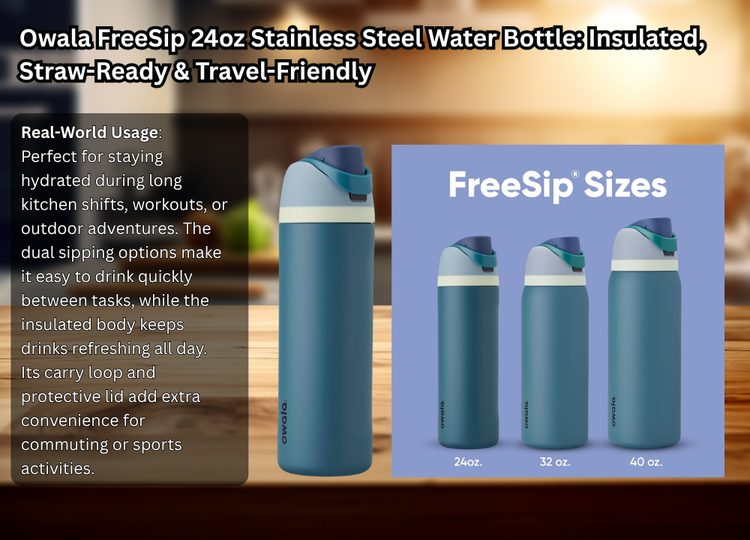 For chefs, home cooks, and active lifestyles, the Owala FreeSip 24oz stainless steel water bottle offers a unique blend of convenience and durability. Its standout feature is the patented FreeSip spout, which allows you to drink upright through the straw or tilt back for a traditional sip, making hydration effortless during busy kitchen prep or on-the-go activities.