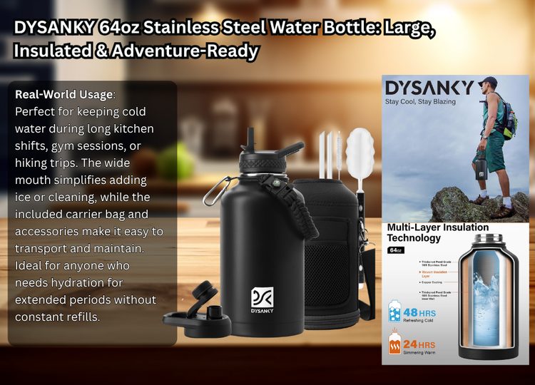 5. DYSANKY 64oz Stainless Steel Water Bottle: Large, Insulated & Adventure-Ready