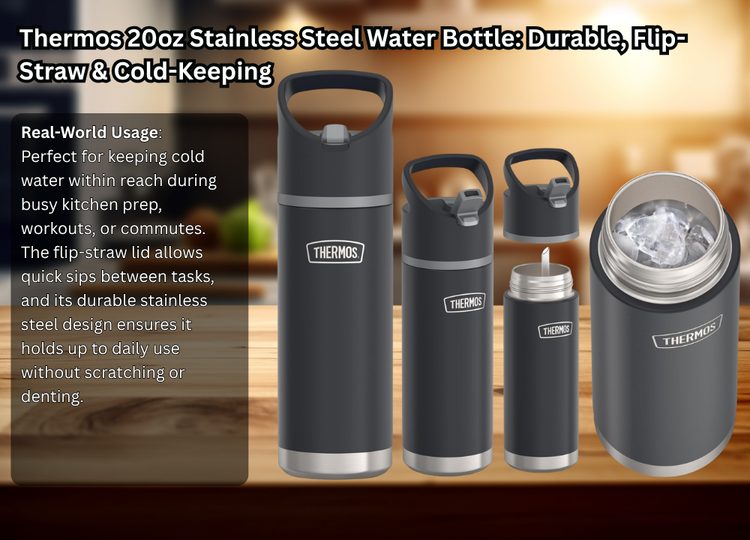 For busy kitchens, gym sessions, or daily commutes, the Thermos 20oz stainless steel water bottle is a practical and dependable choice. Built with high-quality 18/8 stainless steel and vacuum insulation technology, it keeps cold beverages chilled for hours, ensuring you stay hydrated even during long prep shifts or outdoor activities. While it isn’t suitable for hot drinks, its design excels for cold water, iced tea, or infused beverages.