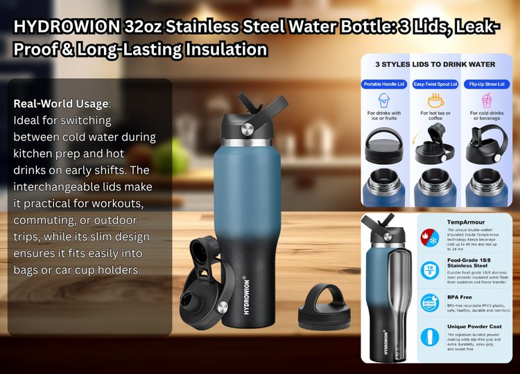 12. HYDROWION 32oz Stainless Steel Water Bottle: 3 Lids, Leak-Proof & Long-Lasting Insulation