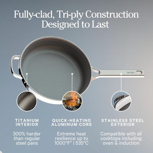 The Standard 10.6″ Our Place Titanium Always Pan Pro is a serious upgrade from conventional ceramic-coated cookware. It delivers stronger searing performance, higher heat tolerance, and significantly better long-term durability.